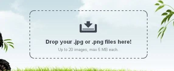 Na parte superior onde está escrito “Drop your .jpg or .png files here!” arraste suas imagens que deseja diminuir o tamanho até lá. Você pode colocar até 20 imagens de no máximo 5mb cada!