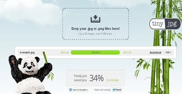 A grande vantagem é que ele é online, você não vai precisar ter programas como Fireworks ou Photoshop para diminuir o tamanho das imagens. O TinyJPG também mantém a qualidade das imagens mesmo diminuindo em até 70% a quantidade de bytes de cada arquivo. É um dos sites para comprimir imagens mais populares de todo o mundo.