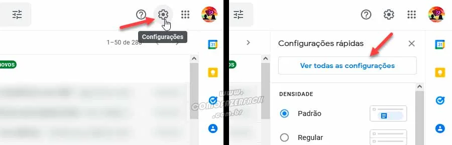 Passo 2: vá até o canto superior direito e clique na engrenagem de Configurações e depois em “Ver todas as configurações”;
