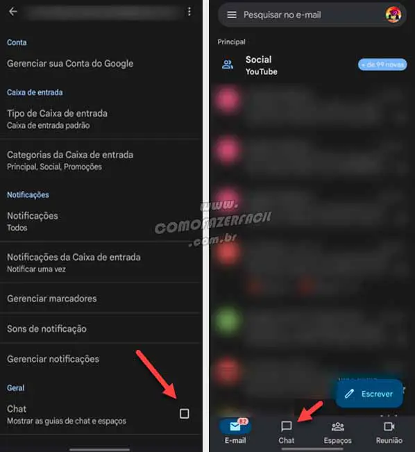 Ativando o Google Chat no aplicativo Gmail para celulares Android.