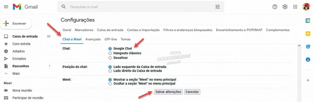 Passo 4: por fim selecione “Google Chat” e clique em “Salvar alterações”.