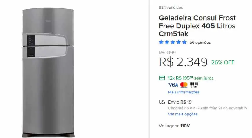 - Geladeira Consul Frost Free Duplex 405 Litros. De R$ 3199 por R$ 2349. Com 26% de desconto. (Confira);