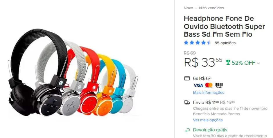 - Headphone Fone De Ouvido Bluetooth Super Bass Sd Fm Sem Fio. De R$ 69 por R$ 33,55. Com 52% de desconto. (Confira);