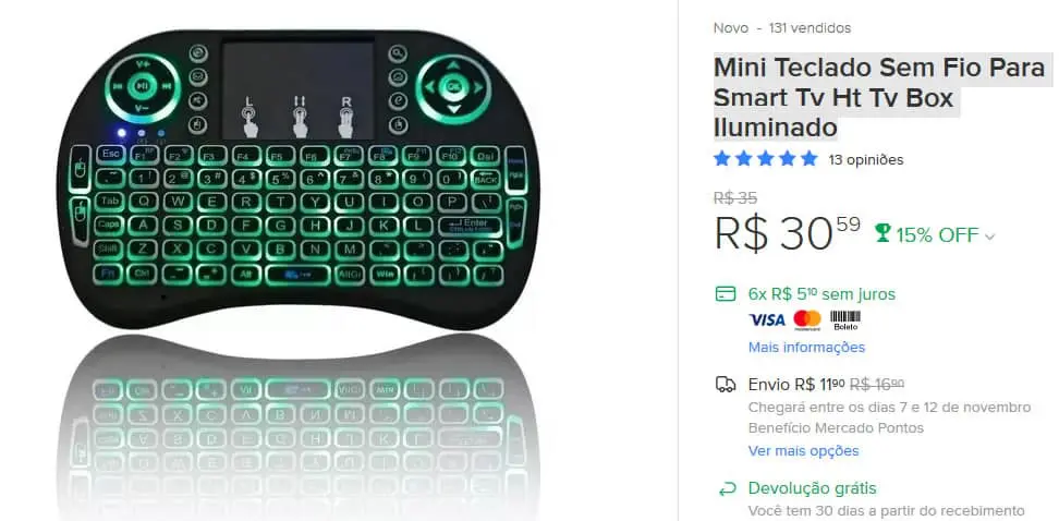 - Mini Teclado Sem Fio Para Smart Tv Ht Tv Box Iluminado. De R$ 35 por R$ 30,59. Com 15% de desconto. (Confira);