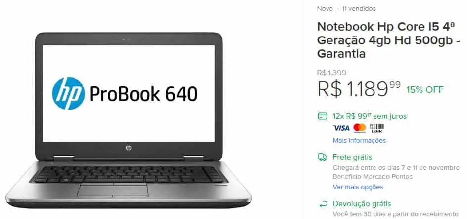 - Notebook HP Core I5 4ª Geração 4gb Hd 500gb. De R$ 1399 por R$ 1189,99. Com 15% de desconto. (Confira);