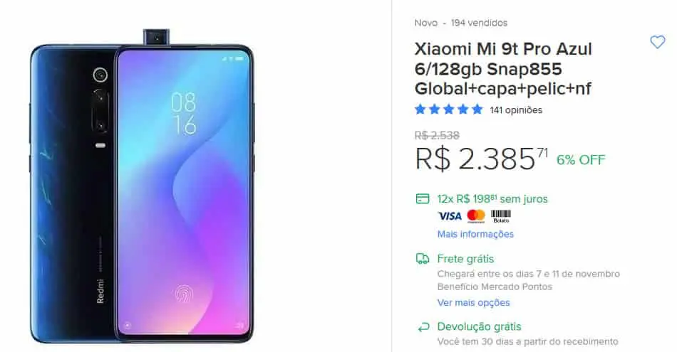 - Xiaomi Mi 9t Pro Azul 6/128gb Snap855. De R$ 2538 por R$ 2385,71*. Com 6% de desconto. (Confira);